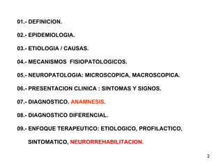 Este documento trata sobre el estudio y enfoque terapéutico de las enfermedades neurológicas. Explica conceptos como la anatomía cerebral, la circulación sanguínea en el cerebro, la sinapsis neuronal, la plasticidad neuronal y la neurorrehabilitación. Resalta que la neurorrehabilitación es un enfoque multidisciplinario que busca estimular de manera temprana y sistemática al paciente según sus capacidades residuales, con el objetivo de reactivar funciones perdidas o compensar las funciones afectadas.