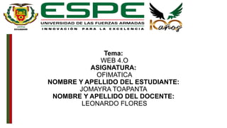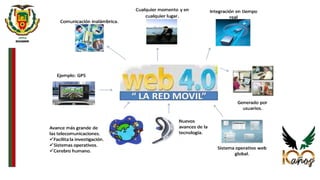 La Web 4.0 es una nueva etapa de Internet que utiliza la inteligencia artificial para interpretar automáticamente la información disponible y apoyar la toma de decisiones. Se caracteriza por ser un sistema operativo dinámico e inteligente capaz de usar y entender los datos. La Web 1.0 era para catálogos en línea, la Web 2.0 incluyó redes sociales y la nube, la Web 3.0 es móvil con geolocalización e Internet de las cosas, y la Web 4.0 es de las máquinas inteligentes.