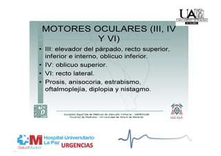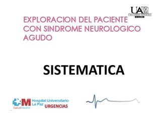 El documento describe los pasos de una exploración neurológica sistemática, incluyendo la valoración del nivel de conciencia, la exploración de los pares craneales, la masa muscular, el tono y la fuerza, la sensibilidad, los reflejos osteotendinosos, la coordinación y la marcha. También incluye detalles sobre cómo explorar cada uno de estos componentes y define algunos términos neurológicos como hipotonía.