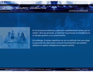 Networking Security Consulting ofrece varios servicios informáticos como el desarrollo de software a medida, asesorías de procesos y proyectos, y mantención de computadores para mejorar la gestión del negocio de sus clientes. La empresa tiene más de 10 años de experiencia brindando soluciones de alta calidad a clientes en diversos sectores. Algunos clientes notables incluyen ASIMET, INMOBILIARIA FORTALEZA, WORLD WINES y LECOLE.