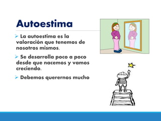 El documento habla sobre la autoestima y la importancia de conocerse a uno mismo. Explica que la autoestima es la valoración que tenemos de nosotros mismos y se desarrolla desde pequeños. Alienta a los niños a quererse a sí mismos y aceptarse, reconociendo tanto sus fortalezas como áreas de mejora. También enfatiza la importancia de las personas que nos quieren y cuidan.