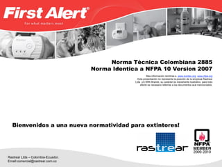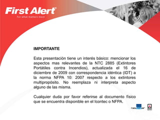Este documento presenta un resumen de los cambios más relevantes introducidos por la Norma Técnica Colombiana 2885 sobre extintores portátiles, la cual es idéntica a la norma NFPA 10:2007. Se destacan elementos como los requisitos de listado y rotulado, la clasificación de incendios, y la selección de extintores según el tipo de incendio. El objetivo es informar sobre esta nueva normatividad de forma concisa sin reemplazar el contenido completo del documento original.