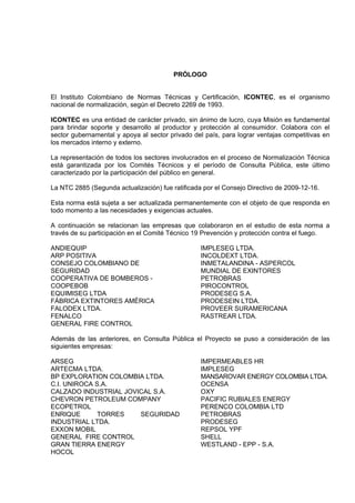 Este documento establece los requisitos para la selección, instalación, inspección, mantenimiento y prueba de extintores portátiles contra incendios. Incluye definiciones, clasificación de incendios, selección de extintores según el riesgo, instalación, inspección, mantenimiento y pruebas hidrostáticas. El objetivo es proporcionar guías para la protección contra incendios mediante el uso adecuado de extintores portátiles.