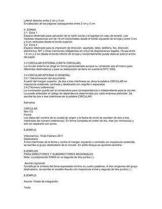 Este documento presenta la Norma Técnica Colombiana NTC 3234, la cual establece los requisitos para la elaboración de circulares. Define términos como circular, destinatario, remitente, entre otros. Clasifica las circulares en externas e internas y según su estilo. Establece requisitos de márgenes, zonas, elementos que debe contener una circular interna como denominación, número, fecha, destinatario, asunto, texto, páginas subsiguientes, despedida, remitente y líneas especiales.