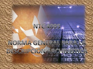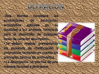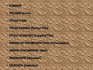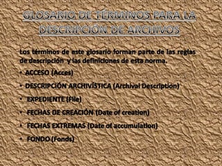 El documento describe los diferentes niveles y áreas de descripción archivística según la norma ISAD(G), incluyendo el área de identificación, contexto, contenido y estructura, condiciones de acceso y utilización, y documentación asociada. Explica conceptos como fondo, serie, tipología documental, sistema de organización, y condiciones que pueden restringir el acceso.