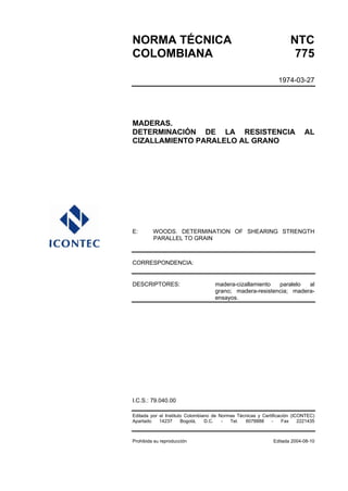 La norma establece el método para determinar la resistencia al cizallamiento paralelo al grano de la madera. Se toman dos probetas de madera de 5x5x6,25 cm y se someten a pruebas de cizallamiento en una prensa. La carga se aplica a 0,6 mm/min hasta la fractura, registrando la carga máxima. Luego se calcula la resistencia al cizallamiento usando la fórmula que relaciona la carga máxima, la superficie de fractura y la humedad de la madera. Los resultados se