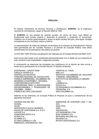 Este documento presenta la Norma Técnica Colombiana NTC-ISO 14001, la cual establece los requisitos para un sistema de gestión ambiental. El documento incluye un prólogo, índice, objetivo y alcance, términos y definiciones, requisitos del sistema de gestión ambiental, y dos anexos. La norma especifica los requisitos para que una organización desarrolle e implemente una política ambiental y objetivos que cumplan con la legislación y consideren los aspectos ambientales significativos.