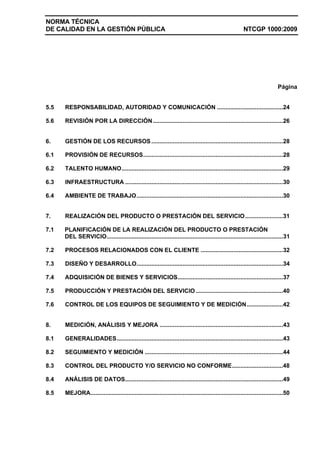 Este documento presenta los requisitos para la implementación de un Sistema de Gestión de la Calidad en la rama ejecutiva del poder público y otras entidades prestadoras de servicios en Colombia. Describe los principios generales de gestión de calidad para estas entidades y establece los lineamientos para que puedan mejorar su desempeño y satisfacer las necesidades de sus clientes de manera eficaz. El documento se basa en las normas internacionales ISO 9000 e ISO 9001 y promueve un enfoque de gestión basado en procesos para controlar
