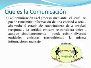 El documento trata sobre la comunicación. Explica que la comunicación es el proceso mediante el cual se transmite información de una entidad a otra, alterando el estado de conocimiento de la entidad receptora. Luego describe algunas funciones de la comunicación como la afectiva, reguladora e informativa. Finalmente, analiza brevemente el origen del lenguaje y nuevas formas de comunicación como las TICs y su impacto en la educación, empresa y sociedad.