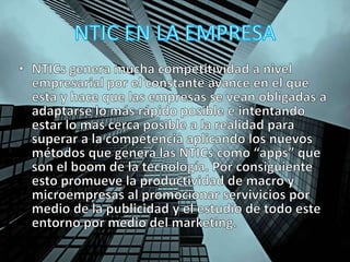 Las NTIC (Nuevas Tecnologías de la Información y la Comunicación) se refieren a los sistemas de información que contribuyen a la comunicación almacenada en Internet en formatos de texto, voz e imágenes con fines académicos, sociales y empresariales a través de blogs, wikis y podcasts. Las NTIC son herramientas que apoyan y fortalecen el proceso de aprendizaje al ofrecer beneficios como la participación activa y la flexibilidad, pero también generan desventajas como la distracción y la falta
