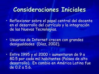 El documento discute la integración de las tecnologías de la información y la comunicación (TIC) en el currículo educativo. Explica que las TIC pueden mejorar el proceso de enseñanza-aprendizaje si se usan como parte de programas y proyectos integrales. También describe algunos proyectos específicos que han integrado con éxito las TIC en las aulas, como el programa KidSmart Pequeño Explorador y el proyecto Tecnologías de Información y Comunicación en la Práctica Pedagógica.