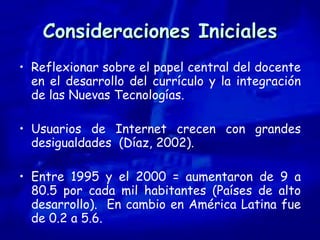 El documento discute la integración de las tecnologías de la información y la comunicación (TIC) en el currículo educativo. Señala que las TIC deben usarse para complementar y no sustituir la enseñanza tradicional. También presenta dos experiencias exitosas de integración de TIC en escuelas latinoamericanas y ofrece recomendaciones para que los docentes seleccionen y utilicen efectivamente las TIC en el aula.