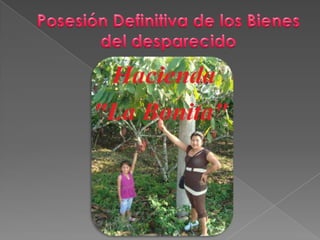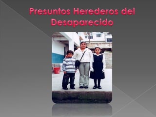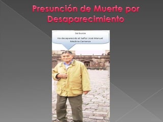El documento trata sobre las normas legales relacionadas con el nacimiento, la muerte y la presunción de fallecimiento de una persona. Se establece que una persona nace legalmente al ser separada completamente de su madre y que se presume que nace con vida a menos que se demuestre lo contrario. También se indica que la presunción de muerte puede declararse por un juez si han pasado al menos dos años desde la última noticia de un desaparecido.