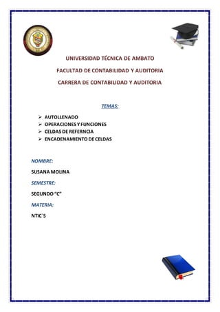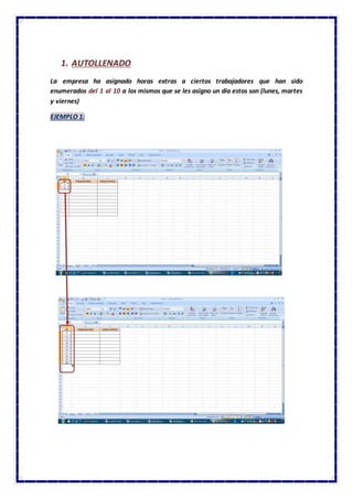 Este documento presenta ejemplos sobre el uso de funciones en Excel para tareas contables como calcular horas extras, realizar roles de pago, y controlar inventarios. Incluye ejemplos de uso de celdas de referencia para vincular datos entre hojas de cálculo y encadenar cálculos entre celdas para operaciones como aplicar descuentos e impuestos a ventas. El propósito es mostrar la aplicación de herramientas de Excel en tareas financieras y de contabilidad.