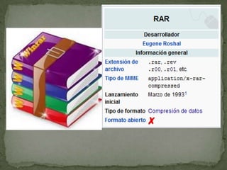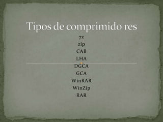 Este documento describe diferentes formatos de compresión de archivos como WinZip, RAR, 7z, CAB, deb y Alien. Explica que WinZip es un compresor comercial que admite formatos como ZIP, RAR y otros, mientras que 7z es un formato de código abierto que logra altas tasas de compresión. También describe los formatos CAB utilizados por Microsoft e instaladores, y deb utilizado por paquetes de software de Debian y derivados como Ubuntu.