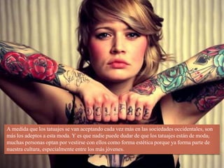 El documento describe los diferentes tipos de tatuajes populares, incluyendo tatuajes realistas, de acuarela, tribales, graffiti, tradicionales, neotradicionales, góticos, escritos, geométricos, de puntos, japoneses, de flechas, glifos, números romanos y más. Los tatuajes sirven para que las personas expresen sus intereses e identidades a través del arte permanente en la piel.