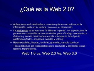 El documento aborda el impacto de la Web 2.0 en la educación, destacando la importancia de la participación activa de los usuarios en la creación de contenido y el aprendizaje colaborativo. Propone una transformación en la enseñanza tradicional hacia un paradigma emergente que integra el e-learning y el uso de aplicaciones web interactivas. Se presentan diversas herramientas y metodologías, como blogs y wikis, que permiten a estudiantes y docentes gestionar y compartir conocimientos de manera efectiva.