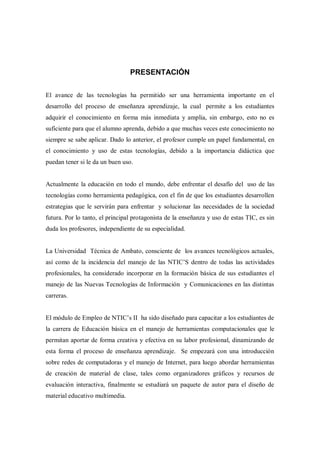 Este documento presenta el plan de estudios para el módulo "NTIC's II" de la carrera de Educación Básica en la Universidad Técnica de Ambato. El módulo se enfoca en capacitar a los estudiantes en el uso de herramientas computacionales para mejorar su labor profesional. El plan describe los objetivos del módulo, la metodología de aprendizaje, el contenido dividido en elementos de competencia, y los materiales de apoyo.