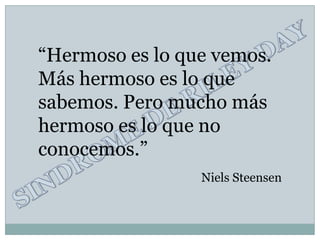 Este documento describe el Síndrome de Riley-Day, un trastorno genético raro caracterizado por la disfunción del sistema nervioso autónomo. Se hereda como un rasgo recesivo y causa incapacidad para sentir dolor, apnea, inestabilidad emocional y otros síntomas. El diagnóstico se realiza mediante exámenes de sangre y pruebas genéticas. El tratamiento busca prevenir lesiones y brindar nutrición y terapias de apoyo.