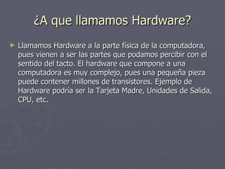 El documento describe diferentes tipos de hardware de computadoras, incluyendo CPU, memoria, periféricos y más. Explica cómo se clasifica el hardware en unidades de almacenamiento, procesamiento, entrada, salida y bidireccionales. También define conceptos clave como byte, hertz, sistema binario y más.