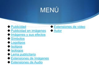 Este documento resume diferentes conceptos relacionados con la publicidad, incluyendo tipos de publicidad como publicidad en imágenes, símbolos, logotipos, isotipos e isologos. También describe extensiones comunes de imágenes, audio y video, así como el significado de un lema publicitario. El autor es Rodrigo Larriba, estudiante de 4to año de la escuela San Luis en 2012.