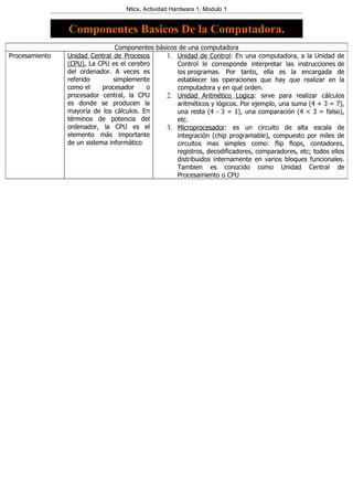 Los componentes básicos de una computadora incluyen la unidad central de procesamiento (CPU), memoria, periféricos de entrada y salida, y almacenamiento. La CPU procesa instrucciones y realiza cálculos. La memoria almacena datos e instrucciones temporalmente. Los periféricos de entrada incluyen teclados, mouse y escáneres, mientras que los periféricos de salida incluyen monitores, impresoras y parlantes. Los dispositivos de almacenamiento como discos duros, CDs y DVDs almacenan