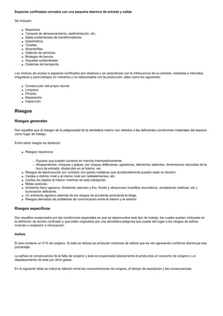 Este documento proporciona información sobre los trabajos en espacios confinados y las medidas de seguridad asociadas. Define un espacio confinado como un área con limitada ventilación y entrada/salida que puede acumular contaminantes o tener una atmósfera deficiente en oxígeno. Describe los riesgos generales como atrapamientos y caídas, y los riesgos específicos como asfixia, incendio, explosión e intoxicación. Explica medidas preventivas como autorización de entrada, medición y evaluación continua de la atmósfer