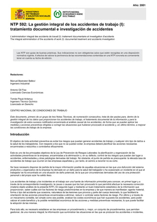Este documento proporciona pautas para la gestión integral de la información sobre accidentes de trabajo, incluyendo el tratamiento documental y la investigación de los accidentes notificados con el fin de analizar las causas y aplicar medidas preventivas. Describe los sistemas de notificación legal requeridos y recomienda mantener registros internos con más detalles para un análisis estadístico que identifique los principales riesgos. Además, explica los aspectos clave que deben incluirse en la documentación de cada accidente o incidente para su est