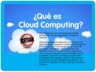 La computación en la nube permite ofrecer servicios de computación a través de Internet almacenando y accediendo a archivos y aplicaciones desde cualquier lugar sin necesidad de instalarlas localmente. Los usuarios ya no necesitan conocimientos técnicos sobre la infraestructura subyacente en la nube que soporta sus actividades.