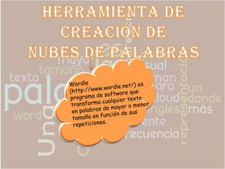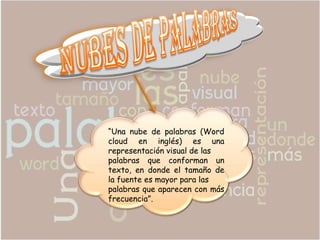 Una nube de palabras es una representación visual de las palabras de un texto donde el tamaño de la fuente de cada palabra depende de su frecuencia en el texto, siendo mayor para las palabras más frecuentes. Se puede utilizar como recurso educativo atractivo para niños, citas literarias o resúmenes, generándose en Wordle al escribir el texto y ajustar opciones como fuente y color.