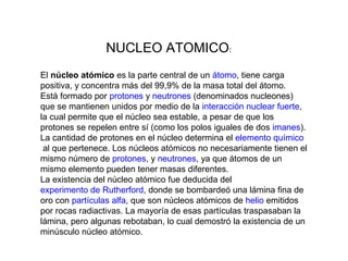 El documento presenta información sobre la historia del descubrimiento de la estructura del núcleo atómico. Explica que en el siglo XIX se propuso la existencia de los átomos como unidades indivisibles que se combinan en proporciones fijas. Más tarde, en 1897 Thomson propuso que los átomos contenían partículas negativas (electrones) incrustadas en una esfera positiva, creando el modelo "pudín de pasas". Experimentos posteriores revelaron la existencia de radiaciones alfa, beta y gamma, l