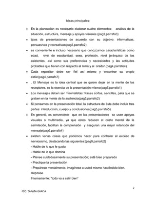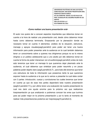 El documento describe los pasos para realizar una buena presentación oral, incluyendo la planeación con el análisis de la situación, estructura, mensaje y apoyos visuales. Explica que se debe conocer al público objetivo y encontrar el estilo propio. Además, destaca la importancia de elaborar un mensaje claro y una estructura con introducción, cuerpo y conclusiones. Finalmente, recomienda evaluar la presentación para mejorar en futuras ocasiones.