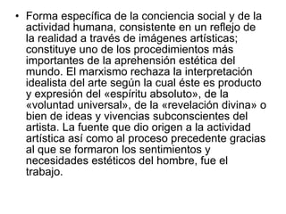 Este documento discute el valor cognitivo del arte desde una perspectiva marxista. Explica que el arte es una forma de reflejar la realidad a través de imágenes y constituye una forma importante de aprehensión estética del mundo. Afirma que el origen del arte y los sentimientos estéticos humanos se encuentra en el trabajo. También describe que la historia del arte refleja cómo se ha profundizado la comprensión estética de la realidad a través del tiempo.