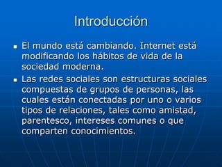 El documento analiza el impacto de las redes sociales en la educación de los estudiantes. Explica que las redes sociales han tenido un gran auge entre los jóvenes y que el objetivo es investigar la importancia de las redes sociales en la vida de los estudiantes de la Universidad Politécnica de San Luís Potosí. El estudio utilizará encuestas y sondeos para analizar el tiempo que los estudiantes pasan en redes sociales y qué redes son más populares entre los jóvenes.
