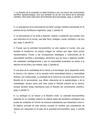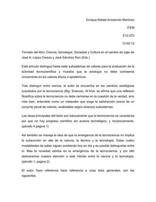 El primer documento discute los diferentes subsistemas de valores que deben considerarse para evaluar la actividad científico-tecnológica, mientras que el segundo documento explora cómo los nuevos entornos virtuales de aprendizaje pueden transmitir valores éticos a las nuevas generaciones. Ambos argumentan que la ciencia, tecnología y educación no son neutrales axiológicamente y moldean tanto los valores como el comportamiento de una sociedad.