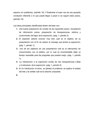 El documento describe los pasos para preparar una buena presentación oral, incluyendo la recopilación de información, la preparación de diapositivas, el uso de la retórica, y el conocimiento del lugar de la presentación. Explica que la introducción debe incluir el título, la estructura de la presentación, y una descripción del problema, estado actual y solución propuesta. El objetivo es que el orador clarifique su mensaje y deje tiempo para preguntas.