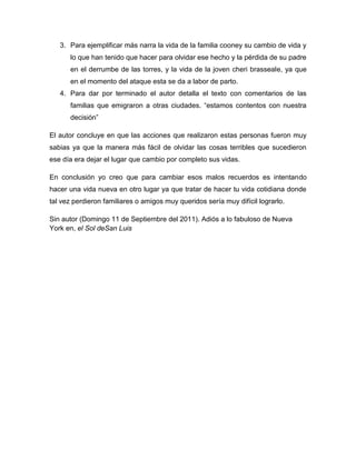 Este documento describe cómo los habitantes de Nueva York han cambiado sus vidas en los 10 años desde los ataques terroristas del 11 de septiembre de 2001. Muchos decidieron mudarse para escapar de los dolorosos recuerdos en la ciudad. El autor narra las historias de dos familias afectadas: los Cooney, que perdieron a su padre, y los Brassale, cuyo hijo nació durante los ataques. Aunque fue difícil dejar atrás lo familiar, las familias están contentas con sus nuevas vidas en otras ciudades, lejos