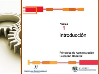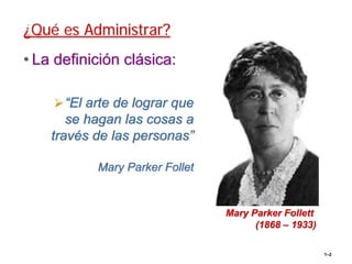 Este documento presenta los principios básicos de la administración. Define la administración como el proceso de obtener, coordinar y aprovechar recursos y personas para lograr los objetivos de una organización. Explica que la eficiencia significa hacer bien las cosas con menos recursos, mientras que la eficacia significa lograr los objetivos planificados. Una administración exitosa logra tanto la eficiencia como la eficacia. Finalmente, presenta varios modelos y figuras que resumen los roles y responsabilidades de los administradores en diferentes niveles y
