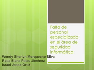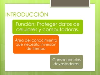 Este documento analiza la falta de especialistas en seguridad informática en San Luis Potosí, México. Presenta la introducción, delimitación del tema, justificación, preguntas de investigación, objetivos, hipótesis, diseño de investigación y cronograma. El objetivo general es analizar las posibles causas por las cuales no existen suficientes profesionistas especializados en seguridad informática en el estado.