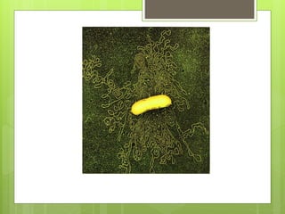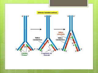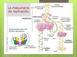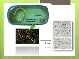 El documento describe la estructura y replicación del cromosoma bacteriano. El cromosoma bacteriano generalmente consiste en un solo cromosoma circular compuesto de ADN, ARN y proteínas. La replicación del cromosoma ocurre de forma bidireccional a partir de un origen de replicación y requiere enzimas como la ADN helicasa, ADN polimerasas y proteínas estructurales como HU.