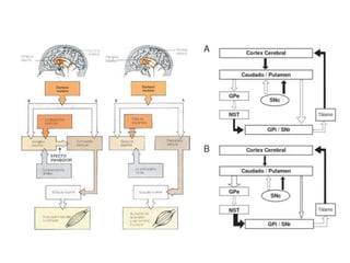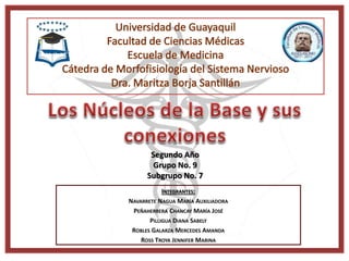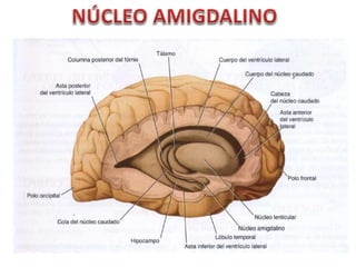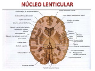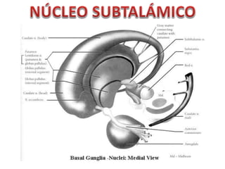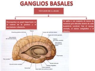 Los núcleos basales desempeñan un papel importante en el control de la postura y el movimiento voluntario. Se aplica a un conjunto de masas de sustancia gris ubicadas dentro de cada hemisferio cerebral, incluyendo el cuerpo estriado, el núcleo amigdalino y el claustro. Los núcleos basales reciben aferencias de la corteza cerebral y el tálamo, y envían eferencias al globo pálido y la sustancia negra, que a su vez proyectan al tálamo para modular el movimiento.