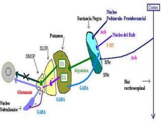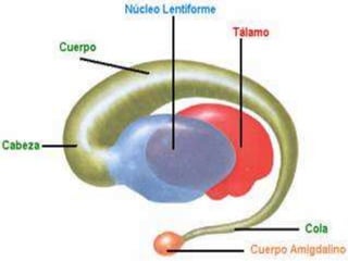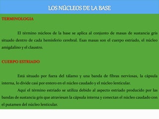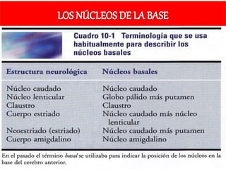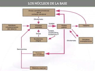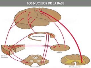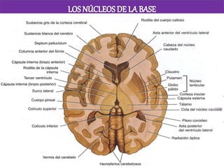 Los principales núcleos de la base son el núcleo caudado, el núcleo lenticular (que incluye el putamen y el globo pálido) y el núcleo amigdalino. Estos núcleos reciben información de la corteza cerebral y el tálamo y envían señales de retroalimentación al tálamo que a su vez se comunica con áreas motoras de la corteza para influir en el control motor. La sustancia negra del mesencéfalo y los núcleos subtalámicos del diencéf