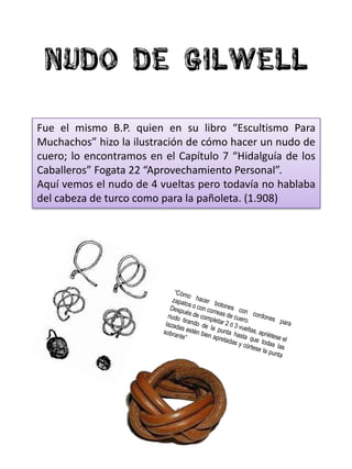 El documento detalla la historia y evolución de los nudos utilizados en el movimiento scout, especialmente el 'nudo cabeza de turco' y el 'nudo de Gilwell'. Se menciona cómo estos nudos se integraron en la formación scout y la insignia de madera, reflejando cambios desde su creación hasta la actualidad. Además, se hace referencia a la importancia de estos nudos en la ceremonia y simbolismo del esculturismo.