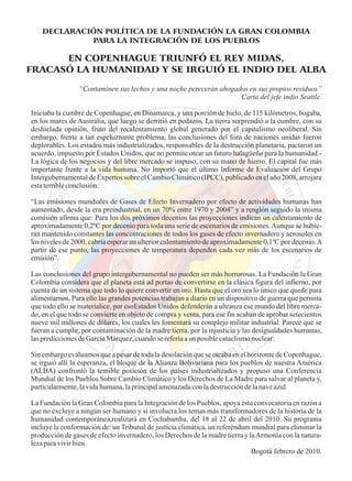 El documento habla sobre la cumbre climática de Copenhague de 2009 y las conclusiones decepcionantes. A pesar de las advertencias científicas sobre el calentamiento global causado por las emisiones humanas, los países industrializados impusieron un acuerdo que no aborda adecuadamente el problema para proteger los intereses comerciales. Sin embargo, el ALBA propuso una conferencia alternativa sobre cambio climático y derechos de la madre tierra en Cochabamba. Aunque el panorama parece desolador, la integración de América Latina a