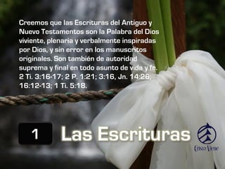 Este documento presenta la base doctrinal de una iglesia cristiana en Costa Rica. Resume 11 puntos principales de doctrina como la inspiración bíblica, la Trinidad, la deidad de Cristo, la obra salvífica de Cristo, la salvación por gracia mediante la fe, la segunda venida de Cristo, la resurrección y el juicio final, y el propósito de la iglesia.