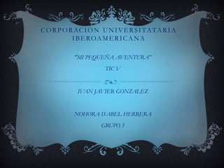 El documento presenta un trabajo del grupo 3 de la Corporación Universitaria Iberoamericana sobre el tema 'Mi pequeña aventura', abordando tecnologías de la información y la comunicación. Se enfoca en la experiencia personal y las enseñanzas obtenidas a lo largo del proceso. Los autores, Iván Javier González y Nohora Isabel Herrera, comparten reflexiones sobre su aprendizaje y desarrollo.