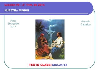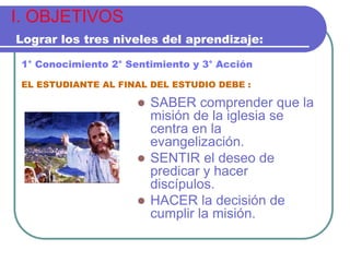 Este documento presenta una lección sobre la misión de la iglesia. Explica que la misión se centra en la evangelización y hacer discípulos a través de la predicación y el testimonio. Jesús usó metáforas como lámpara y testigo para describir esta misión. Encargó a la iglesia los ministerios de predicación y discipulado para llevar el evangelio a todas las naciones. Todo cristiano debe sentir el deseo de cumplir esta misión al estar convencido del mensaje, haber sido enviado por Dios y estar dispuesto a comunic