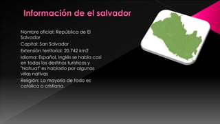 El Salvador es una república ubicada en Centroamérica con una extensión de 20,742 km2. Algunos de los principales destinos turísticos incluyen playas como Playa Las Tunas, Playa Salinitas y el Golfo de Fonseca, así como volcanes como el volcán de Izalco, el Cerro El Pital y el Complejo de Volcanes. Otros lugares populares son el Ecoparque El Espino, Punta Roca para surf, Santa Rosa Guachipilín para rafting y La Puerta del Diablo para canopy.