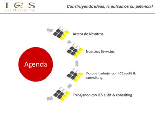 ICS audit & consulting es una compañía líder en servicios de auditoría interna, prevención de fraudes, capacitación y outsourcing. Ofrece cuatro líneas principales de servicio: auditoría y gestión de riesgos, desarrollo organizacional, servicios de administración e información, y tecnologías de la información. La compañía tiene una amplia cartera de clientes de diversos sectores y cuenta con equipos de profesionales capacitados para brindar soluciones especializadas y de alta calidad.