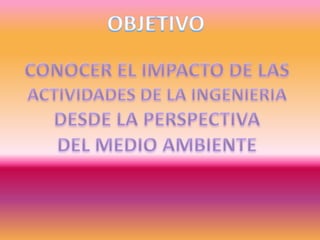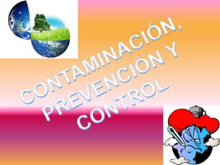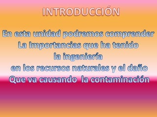 Este documento trata sobre ecología, ecosistemas, recursos naturales, fuentes de energía, contaminación, y actividades relacionadas con el medio ambiente. Define conceptos clave como ecología, ecosistema, recursos renovables y no renovables, fuentes de energía naturales y alternativas, y tipos de contaminación. Además, explica la diferencia entre prevención y control de la contaminación.